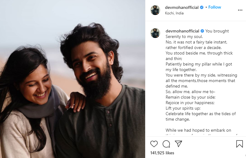 “നീയാണ് എന്റെ ആത്മാവിലേക്ക് വെളിച്ചം കൊണ്ടുവന്നത്. അല്ല, അതൊരു നാടോടിക്കഥ പോലെയേ ആയിരുന്നില്ല. മറിച്ച് ഒരു പതിറ്റാണ്ടുകൊണ്ട് ബലംവച്ചതാണ്. എന്റെ ഉയര്ച്ചകളിലും വീഴ്ചകളിലും നീ എനിക്കൊപ്പം നിന്നു. ഞാനെന്റെ ജീവിതം കരുപ്പിടിപ്പിക്കുമ്പോള് ക്ഷമയോടെ എനിക്ക് കരുത്തേകി. എന്റെ ജീവിതത്തെ നിര്വ്വചിച്ച എല്ലാ നിമിഷങ്ങളിലും നീ അവിടെയുണ്ടായി. അതിനാല് നിന്നോട് ചേര്ന്നു നില്ക്കാന് എന്നെ അനുവദിക്കുക. നിന്റെ സന്തോഷങ്ങളില് ആനന്ദിക്കാന്, ജീവിതം ഒരുമിച്ച് ആഘോഷിക്കാന്”. ഇന്സ്റ്റഗ്രാമില് ഈ പോസ്റ്റിനു താഴെ ‘സൂഫി’യില് ദേവിനൊപ്പം പ്രധാന കഥാപാത്രത്തെ അവതരിപ്പിച്ച അദിതി റാവു ഹൈദരിയും ചിത്രത്തിന്റെ സംവിധായകന് നരണിപ്പുഴ ഷാനവാസും അടക്കമുള്ളവര് ആശംസകളുമായി എത്തി.