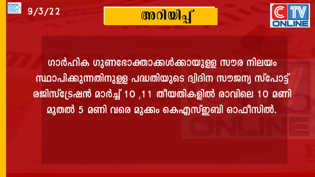 ഗാർഹിക ഗുണഭോക്താക്കൾക്കായുള്ള സൗര നിലയം സ്ഥാപിക്കുന്നതിനുള്ള പദ്ധതിയുടെ ദ്വിദിന സൗജന്യ സ്പോട്ട് രജിസ്ട്രേഷൻ മാർച്ച് 10 ,11 തീയതികളിൽ രാവിലെ 10 മണി മുതൽ 5 മണി വരെ മുക്കം കെഎസ്ഇബി ഓഫീസിൽ.