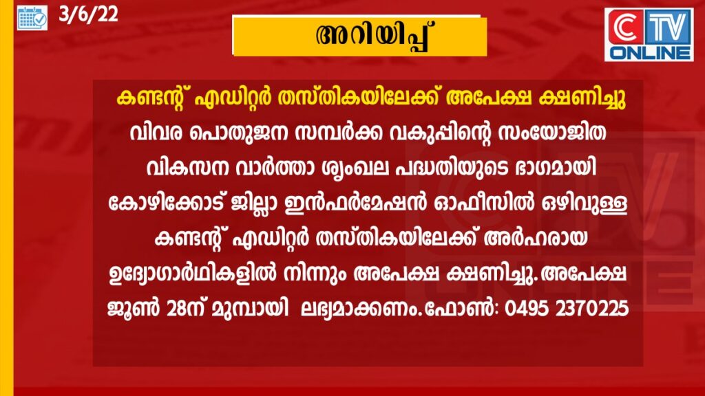 വിവര പൊതുജന സമ്പര്‍ക്ക വകുപ്പിന്റെ സംയോജിത വികസന വാര്‍ത്താ ശൃംഖല പദ്ധതി യുടെ ഭാഗമായി കോഴിക്കോട് ജില്ലാ ഇന്‍ഫര്‍മേഷന്‍ ഓഫീസില്‍ ഒഴിവുള്ള കണ്ടന്റ് എഡിറ്റര്‍ തസ്തികയിലേക്ക് അര്‍ഹരായ ഉദ്യോഗാര്‍ഥികളില്‍നിന്നും അപേക്ഷ ക്ഷണിച്ചു. അപേക്ഷ ജൂണ്‍ 28ന് മുമ്പായി കോഴിക്കോട് ജില്ലാ ഇന്‍ഫര്‍മേഷന്‍ ഓഫീസില്‍ ലഭ്യമാക്കണം.ഫോണ്‍: 0495 2370225.