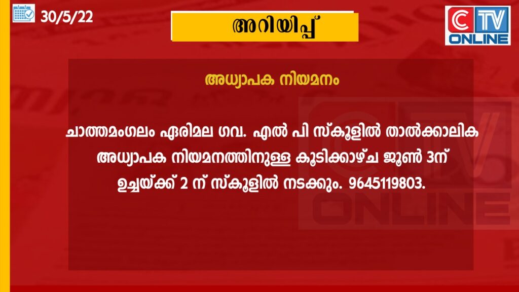 ചാത്തമംഗലം ഏരിമല ഗവ. എൽ പി സ്കൂളിൽ താൽക്കാലിക അധ്യാപക നിയമനത്തിനുള്ള കൂടിക്കാഴ്ച ജൂൺ 3ന് ഉച്ചയ്ക്ക് 2 ന് സ്കൂളിൽ നടക്കും. കൂടുതൽ വിവരങ്ങൾക്ക് 9645119803.