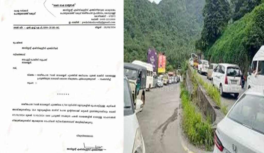 താമരശ്ശേരി : ദേശീയപാത 766 ൽ താമരശ്ശേരി ചുരത്തിലെ 6,7,8 വളവുകളിൽ രൂപപ്പെട്ടിട്ടുള്ള കുഴികൾ അടയ്ക്കുന്നതിനും 2,4 വളവുകളിലെ താഴ്‌ന്ന് പോയ ഇൻ്റർലോക്ക് കട്ടകൾ ഉയർത്തുന്നതിനും വേണ്ടി 07/10/2024 മുതൽ 11/10/2024 വരെ പ്രവൃത്തി നടക്കുന്ന പകൽ സമയങ്ങളിൽ ഭാരമുള്ള വാഹനങ്ങൾക്ക് നിയന്ത്രണം ഏർപ്പെടുത്തിയതായി അസിസ്റ്റന്റ് എക്‌സിക്യൂട്ടീവ് എഞ്ചിനീയർ അറിയിച്ചു