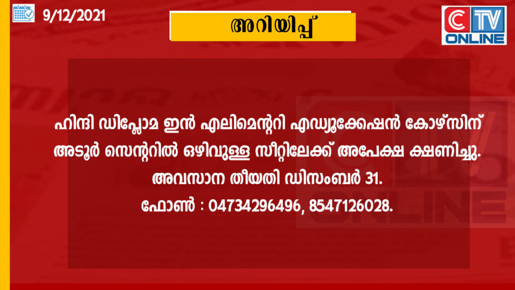 ഹിന്ദി ഡിപ്ലോമ ഇന് എലിമെന്ററി എഡ്യൂക്കേഷന് കോഴ്സിന് അടൂര് സെന്ററില് ഒഴിവുള്ള സീറ്റിലേക്ക് അപേക്ഷ ക്ഷണിച്ചു. പി.എസ്.സി അംഗീകരിച്ച കോഴ്സിന് എസ്എസ്എല്സിയും 50 ശതമാനം മാര്ക്കോടെ രണ്ടാം ഭാഷ ഹിന്ദിയോടുകൂടിയുള്ള പ്ലസ് ടുവുമാണ് യോഗ്യത. ഭൂഷണ്, സാഹിത്യവിശാരദ്, പ്രവീണ്, സാഹിത്യാചാര്യ, ഹിന്ദി ബി.എ, എം.എ എന്നിവയും പരിഗണിക്കും. പ്രായം: 17 വയസിനും 35നുമിടയില്. ഉയര്ന്ന പ്രായപരിധിയില് പട്ടികജാതി പട്ടികവര്ഗക്കാര്ക്ക് അഞ്ചു വര്ഷവും മറ്റു പിന്നോക്കക്കാര്ക്ക് മൂന്നു വര്ഷവും ഇളവ് അനുവദിക്കും. പട്ടികജാതി, മറ്റര്ഹവിഭാഗത്തിന് ഇ-ഗ്രാന്റ് വഴി ഫീസ് സൗജന്യം ഉണ്ടായിരിക്കും. അവസാന തീയതി ഡിസംബര് 31. വിലാസം – പ്രിന്സിപ്പാള്, ഭാരത് ഹിന്ദി പ്രചാര കേന്ദ്രം, അടൂര്, പത്തനംതിട്ട ജില്ല. 04734296496, 8547126028.