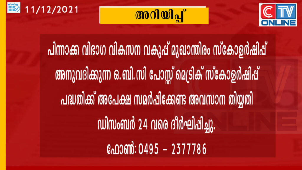പിന്നാക്ക വിഭാഗ വികസന വകുപ്പ് മുഖാന്തിരം സ്കോളര്ഷിപ്പ് അനുവദിക്കുന്ന ഒ.ബി.സി പോസ്റ്റ് മെട്രിക് സ്കോളര്ഷിപ്പ് പദ്ധതിക്ക് അപേക്ഷ സമര്പ്പിക്കേണ്ട അവസാന തിയ്യതി ഡിസംബര് 24 വരെ ദീര്ഘിപ്പിച്ചു.