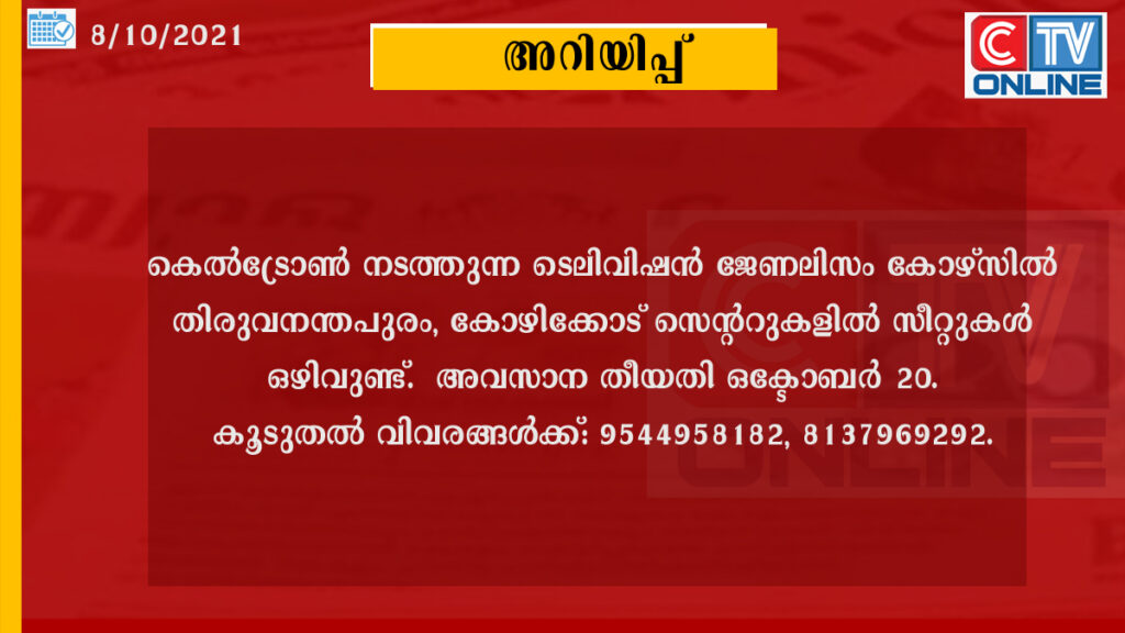 കെല്ട്രോണ് നടത്തുന്ന ടെലിവിഷന് ജേണലിസം കോഴ്സില് തിരുവനന്തപുരം, കോഴിക്കോട് സെന്ററുകളില് സീറ്റുകള് ഒഴിവുണ്ട്. ഏതെങ്കിലും വിഷയത്തില് ബിരുദം നേടിയവര്ക്ക് വിദ്യാഭ്യാസ രേഖകളുമായി നേരിട്ടെത്തി അഡ്മിഷന് എടുക്കാം. അവസാന തീയതി ഒക്ടോബര് 20. പ്രായപരിധി 30 വയസ്. പ്രിന്റ് ജേണലിസം, മൊബൈല് ജേണലിസം എന്നിവയിലും പരിശീലനം ലഭിക്കും. മാധ്യമ സ്ഥാപനങ്ങളില് പരിശീലനം, ഇന്റേണ്ഷിപ്പ്, പ്ലേസ്മെന്റ് സഹായം എന്നിവ നിബന്ധനകള്ക്ക് വിധേയമായി ലഭിക്കും.കൂടുതല് വിവരങ്ങള്ക്ക്: 9544958182, 8137969292.
