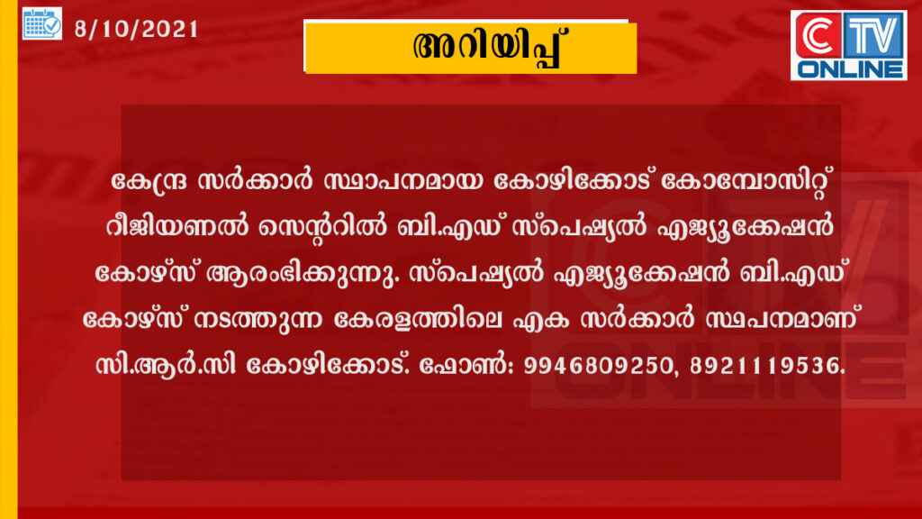കേന്ദ്ര സര്ക്കാര് സ്ഥാപനമായ കോഴിക്കോട് കോമ്പോസിറ്റ് റീജിയണല് സെന്ററില് (സി.ആര്.സി) ബി.എഡ് സ്പെഷ്യല് എജ്യൂക്കേഷന് കോഴ്സ് ആരംഭിക്കുന്നു. റീഹാബിലിറ്റേഷന് കൗണ്സില് ഓഫ് ഇന്ത്യയുടെ അംഗീകാരമുളള കോഴ്സ് കാലിക്കറ്റ് യൂണിവേഴ്സിറ്റിയുടെ അഫിലിയേഷനോടെയാണ് നടത്തുന്നത്. സ്പെഷ്യല് എജ്യൂക്കേഷന് ബി.എഡ് കോഴ്സ് നടത്തുന്ന കേരളത്തിലെ എക സര്ക്കാര് സ്ഥപനമാണ് സി.ആര്.സി കോഴിക്കോട്. കോഴ്സിലേക്കുള്ള അഡ്മിഷന് കാലിക്കറ്റ് യൂണിവേഴ്സിറ്റിയുടെ ഓണ്ലൈന് അഡ്മിഷന് പോര്ട്ടല് വഴിയാണ് നടത്തുന്നത്. അപേക്ഷിക്കുന്നതിനായി https://admission.uoc.ac.in/ ലിങ്ക് ഉപയോഗിക്കാം. ഫോണ്: 9946809250, 8921119536.