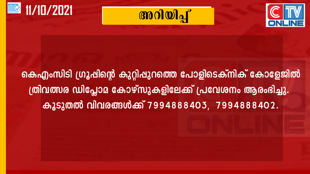 കെഎംസിടി ഗ്രൂപ്പിന്റെ കുറ്റിപ്പുറത്തെ പോളിടെക്നിക് കോളേജിൽ ത്രിവത്സര ഡിപ്ലോമ കോഴ്സുകളിലേക്ക് പ്രവേശനം ആരംഭിച്ചു. എസ്എസ്എൽസി പാസായവർക്ക് മൂന്നുവർഷംകൊണ്ടും പ്ലസ് ടു സയൻസ് പൂർത്തീകരിച്ചവർക്ക് ലാറ്ററൽ എൻട്രി രണ്ടു വർഷം കൊണ്ടും പഠനം പൂർത്തിയാക്കാം.സ്കോളർഷിപ്പോടെ പഠിക്കാനുള്ള അവസരവുമുണ്ട്. കൂടുതൽ വിവരങ്ങൾക്ക് : 7994888403, 7994888402