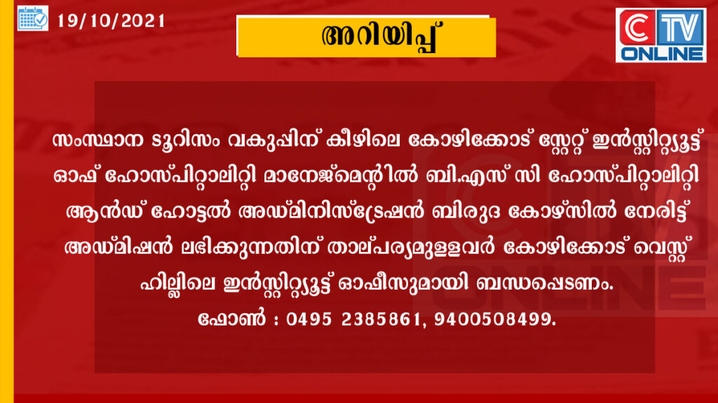 സംസ്ഥാന ടൂറിസം വകുപ്പിന് കീഴിലെ കോഴിക്കോട് സ്റ്റേറ്റ് ഇന്‍സ്റ്റിറ്റ്യൂട്ട് ഓഫ് ഹോസ്പിറ്റാലിറ്റി മാനേജ്‌മെന്റില്‍ ബി.എസ് സി ഹോസ്പിറ്റാലിറ്റി ആന്‍ഡ് ഹോട്ടല്‍ അഡ്മിനിസ്ട്രേഷന്‍ ബിരുദ കോഴ്സില്‍ നേരിട്ട് അഡ്മിഷന്‍ ലഭിക്കുന്നതിന് താല്പര്യമുള്ളവര്‍ കോഴിക്കോട് വെസ്റ്റ് ഹില്ലിലെ ഇന്‍സ്റ്റിറ്റ്യൂട്ട് ഓഫീസുമായി ബന്ധപ്പെടണം. മൂന്ന് വര്‍ഷത്തെ തൊഴിലധിഷ്ഠിത കോഴ്‌സാണിത്. കേന്ദ്ര ടൂറിസം മന്ത്രാലയത്തിനു കീഴിലുള്ള നാഷണല്‍ കൌണ്‍സില്‍ ഫോര്‍ ഹോട്ടല്‍ മാനേജ്മെന്റ് ആന്റ് കാറ്ററിംഗ് ടെക്നോളജിയുടെയും ഇന്ദിരാഗാന്ധി നാഷണല്‍ ഓപ്പണ്‍ യുനിവേര്‍സിറ്റിയുടെയും അംഗീകാരത്തോടെയാണ് ആറ് സെമസ്റ്ററിലായി നടത്തുന്ന ബി.എസ് സി ഹോസ്പിറ്റാലിറ്റി ആന്‍ഡ് ഹോട്ടല്‍ അഡ്മിനിസ്ട്രേഷന്‍ ബിരുദകോഴ്സ് നടത്തുന്നത്.