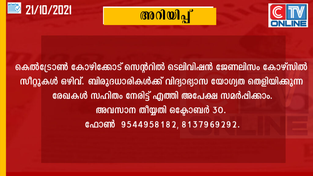 കെല്‍ട്രോണ്‍ കോഴിക്കോട് സെന്ററില്‍ ടെലിവിഷന്‍ ജേണലിസം കോഴ്സില്‍ സീറ്റുകള്‍ ഒഴിവ്. ബിരുദധാരികള്‍ക്ക് വിദ്യാഭ്യാസ യോഗ്യത തെളിയിക്കുന്ന രേഖകള്‍ സഹിതം നേരിട്ട് എത്തി അപേക്ഷ സമര്‍പ്പിക്കാം. പഠനസമയത്ത്  വാര്‍ത്ത ചാനലില്‍ പരിശീലനം, ഇന്റേണ്‍ഷിപ്പ്, പ്ലേസ്മെന്റ്  സഹായം എന്നിവ നിബന്ധനകള്‍ക്ക് വിധേയമായി ലഭിക്കും. അവസാന തീയ്യതി ഒക്ടോബര്‍ 30. വിലാസം: കെല്‍ട്രോണ്‍ നോളഡ്ജ് സെന്റര്‍, അംബേദ്കര്‍ ബില്‍ഡിംഗ്, റെയില്‍വേ സ്റ്റേഷന്‍ ലിങ്ക് റോഡ്, കോഴിക്കോട്, 673002. വിശദ വിവരങ്ങള്‍ക്ക് : 9544958182, 8137969292.