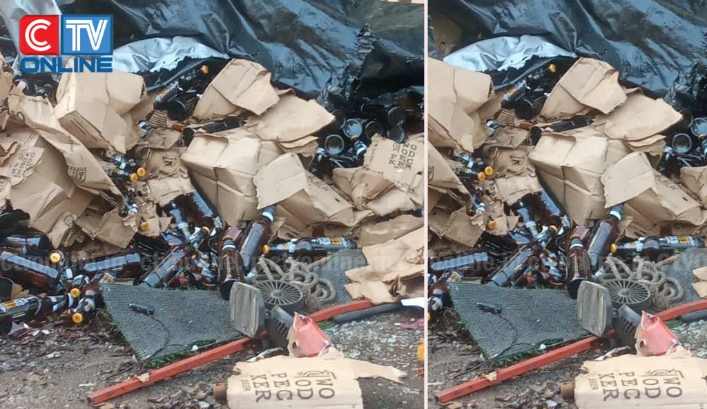 റോഡിൽ ചിതറി തെറിച്ച മദ്യ കുപ്പികൾ എക് സൈസ് അധികൃതർ എത്തിയ ശേഷം നീക്കം ചെയ്തു .