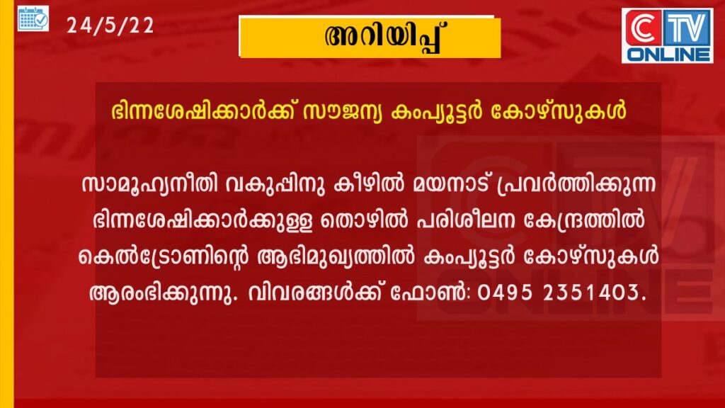 സാമൂഹ്യനീതി വകുപ്പിനു കീഴില് മയനാട് പ്രവര്ത്തിക്കുന്ന ഭിന്നശേഷിക്കാര്ക്കുള്ള തൊഴില് പരിശീലന കേന്ദ്രത്തില് കെല്ട്രോണിന്റെ ആഭിമുഖ്യത്തില് കംപ്യൂട്ടര് കോഴ്സുകള് ആരംഭിക്കുന്നു. ഒരുവര്ഷം ദൈര്ഘ്യമുള്ള ഡി.സി.എ., ഡേറ്റാ എന്ട്രി ആന്ഡ് ഡി.ടി.പി കോഴ്സുകളിലേക്കാണ് പ്രവേശനം. അപേക്ഷ ജൂണ് നാലിനകം പരിശീലന കേന്ദ്രത്തില് ലഭ്യമാക്കണം. വിവരങ്ങള്ക്ക് ഫോണ്: 0495 2351403.