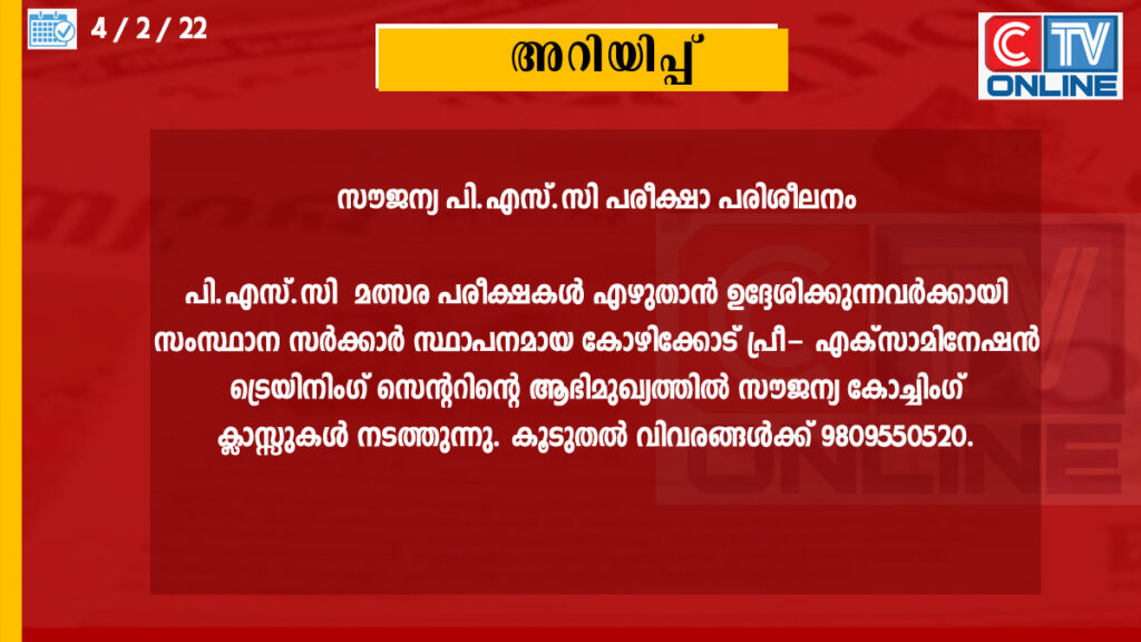 പി.എസ്.സി മത്സര പരീക്ഷകൾ എഴുതാൻ ഉദ്ദേശിക്കുന്നവർക്കായി സംസ്ഥാന സർക്കാർ സ്ഥാപനമായ കോഴിക്കോട് പ്രീ- എക്സാമിനേഷൻ ട്രെയിനിംഗ് സെന്ററിന്റെ ആഭിമുഖ്യത്തിൽ സൗജന്യ കോച്ചിംഗ് ക്ലാസ്സുകൾ നടത്തുന്നു. പട്ടികജാതി, വർഗ്ഗക്കാർക്കും ഒരു ലക്ഷത്തിൽ താഴെ വാർഷിക കുടുംബ വരുമാനമുള്ള ഒ.ബി.സി , ഒ.ഇ.സി വിഭാഗത്തിൽപ്പെട്ടവർക്കും അപേക്ഷിക്കാം. പട്ടികജാതി, വർഗ്ഗവിഭാഗ ത്തിൽപ്പെട്ട വിദ്യാർത്ഥികൾക്ക് സ്റ്റൈപ്പെൻ്റ് ലഭിക്കും. പരിശീലന കാലാവധി ആറ് മാസം. താൽപര്യമുള്ളവർ ജാതി, വരുമാനം രോഗ്യത എന്നിവ തെളിയിക്കുന്നതിനുള രേഖകൾ, ഫോൺനമ്പർ, പൂർണ്ണ വിലാസം എന്നിവ സഹിതമുള്ള അപേക്ഷ ഫെബ്രുവരി 19 നു മുമ്പായി പ്രിൻസിപ്പാൾ, പ്രീ എക്സാമിനേഷൻ ട്രെയിനിംഗ് സെന്റർ, യൂത്ത് ഹോസ്റ്റലിനു സമീപം, ഈസ്റ്റ്ഹിൽ, കോഴിക്കോട് 5 എന്ന വിലാസത്തിൽ നേരിട്ടോ തപാൽ മുഖാന്തിരമോ സമർപ്പിക്കണം. അപൂർണ്ണമായ അപേക്ഷകൾ സ്വീകരിക്കുന്നതല്ല. അപേക്ഷാ ഫോമിനും മറ്റു വിവരങ്ങൾക്കും 9809550520 എന്ന നമ്പറിലേക്ക് “Form’ എന്ന് വാട്സ്ആപ് ചെയ്യണമെന്ന് പ്രിൻസിപ്പാൾ അറിയിച്ചു.