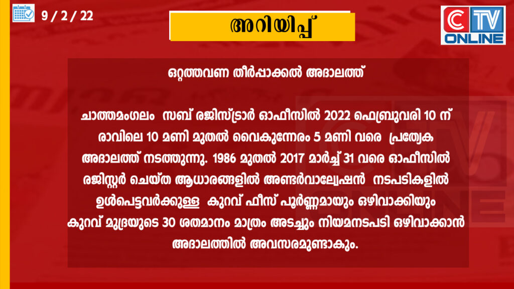 ചാത്തമംഗലം സബ് രജിസ്ട്രാർ ഓഫീസിൽ 2022 ഫെബ്രുവരി പത്താം തീയതി വ്യാഴാഴ്ച രാവിലെ 10 മണി മുതൽ വൈകുന്നേരം 5 മണി വരെ പ്രത്യേക അദാലത്ത് നടത്തുകയാണ്. 1986 മുതൽ 2017 മാർച്ച് 31 വരെ വിലകുറച്ച് ആധാരം രജിസ്റ്റർ ചെയ്ത് അണ്ടർ വാല്യുവേഷൻ നടപടികൾക്ക് വിധേയമായ കേസുകൾക്ക് കേരള സർക്കാർ പൊതു ജനങ്ങളുടെ സൗകര്യാർത്ഥം നടപ്പാക്കിയ ഒറ്റത്തവണ തീർപ്പാക്കൽ പദ്ധതി 2022 മാർച്ച് 31 വരെ ദീർഘിപ്പിച്ചിട്ടുണ്ട്. ഇത്തരം അണ്ടർ വാല്യുവേഷൻ കേസുകളിൽ അടയ്ക്കേണ്ട ഫീസ് പൂർണമായും ഒഴിവാക്കികൊണ്ട് അടക്കേണ്ട മുദ്ര വിലയുടെ 30 ശതമാനം മാത്രം ഈടാക്കി കേസുകൾ തീർപ്പാക്കുകയാണ്.
