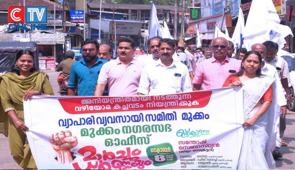 അനിയന്ത്രിതമായി നടത്തുന്ന വഴിയോര കച്ചവടം നിയമനാനുസൃതം നടത്തണമെന്നും, വർദ്ദധിപ്പിച്ച തൊഴിൽ നികുതി പിൻവലിക്കണമെന്നും ആവശ്യപ്പെട്ടുകൊണ്ട് വ്യാപാരി വ്യവസായി സമിതി മുക്കം നഗരസഭയിലേക്ക് മാർച്ചും, ധർണയും സംഘടിപ്പിച്ചു