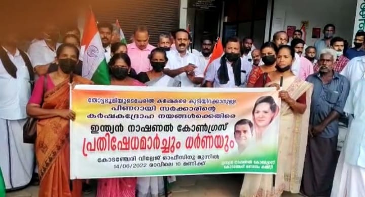 കോടഞ്ചേരി വില്ലേജിലെ ശാന്തിനഗർ പ്രദേശത്തെ എല്ലാ റവന്യൂ രേഖകളും ഉള്ള കൃഷിഭൂമി ഒരു മുന്നറിയിപ്പുമില്ലാതെ തോട്ട ഭൂമിയായി തരംതിരിച്ച് നിർമ്മാണപ്രവർത്തനങ്ങൾ തടഞ്ഞ പിണറായി സർക്കാരിൻറെ നടപടിയിൽ പ്രതിഷേധിച്ച് മണ്ഡലം കോൺഗ്രസ് കമ്മിറ്റി കോടഞ്ചേരി വില്ലേജ് ഓഫീസിലേക്ക് പ്രതിഷേധ മാർച്ചും ധർണയും നടത്തി. കുടിയേറ്റ കാലംതൊട്ട് എല്ലാ റവന്യൂ രേഖകളും ഉള്ള കൃഷിഭൂമി ആയ 464 ഏക്കർ ഭൂമി ഒരു മുന്നറിയിപ്പുമില്ലാതെ തോട്ടഭൂമി ആയി തരംതിരിച്ച്124 കർഷകരുടെ എല്ലാ കാർഷിക നിർമ്മാണ പ്രവർത്തനങ്ങളും വിലക്കിയ സർക്കാർ നടപടി അടിയന്തരമായി പിൻവലിക്കണമെന്നും പ്രതിഷേധ ധർണ ഉദ്ഘാടനം ചെയ്തുകൊണ്ട് ജില്ലാ പഞ്ചായത്ത് മെമ്പർ ബോസ് ജേക്കബ് ആവശ്യപ്പെട്ടു.