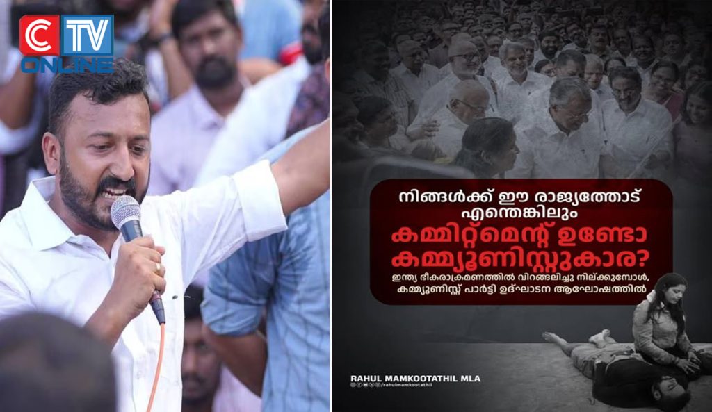 ഇന്ത്യ എന്ന നമ്മുടെ ഈ രാജ്യം ഒരു ഭീകരാക്രമണത്തിൽ വിറച്ചു വിറങ്ങലിച്ച് വേദനിച്ചു നില്ക്കുമ്പോൾ ഇതുപോലൊരു ഉദ്ഘാടന മാമാങ്കം നടത്താൻ നാണമുണ്ടോ കമ്മ്യൂണിസ്റ്റുകാരാ? ചോദ്യവുമായി രാഹുൽ മാങ്കൂട്ടത്തിലിന്റെ ഫേസ്ബുക്ക് പോസ്റ്റ് .
