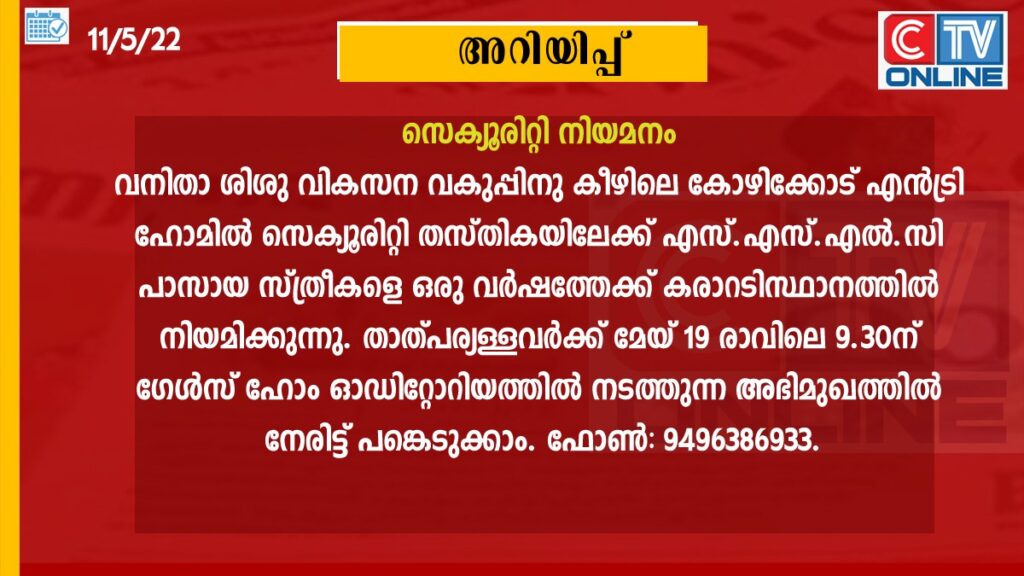 വനിതാ ശിശു വികസന വകുപ്പിനു കീഴിലെ കോഴിക്കോട് എൻട്രി ഹോമിൽ (നിർഭയ ഷെൽട്ടർ ഹോം) സെക്യൂരിറ്റി തസ്തികയിലേക്ക് എസ്.എസ്.എൽ.സി പാസായ സ്ത്രീകളെ ഒരു വർഷത്തേക്ക് കരാറടിസ്ഥാനത്തിൽ നിയമിക്കുന്നു. താത്പര്യള്ളവർക്ക് മേയ് 19 രാവിലെ 9.30 ന് കോഴിക്കോട് ഗവ. ചിൽഡ്രൻസ് ഹോം വെള്ളിമാട്കുന്നിലുള്ള ഗേൾസ് ഹോം ഓഡിറ്റോറിയത്തിൽ നടത്തുന്ന അഭിമുഖത്തിൽ നേരിട്ട് പങ്കെടുക്കാം. വിവരങ്ങൾക്ക് ഫോൺ: 9496386933.