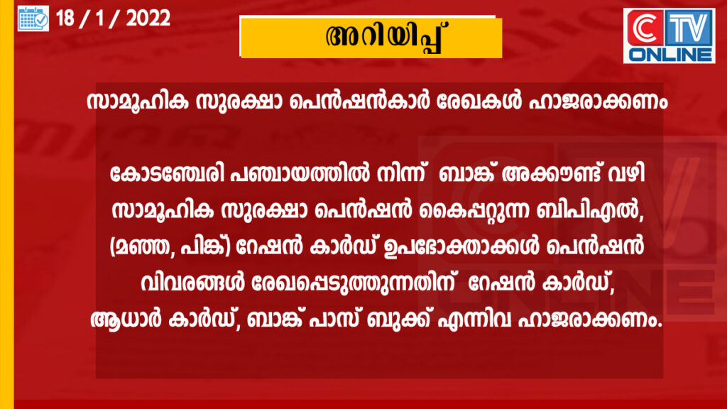 കോടഞ്ചേരി പഞ്ചായത്തിൽ നിന്ന് ഇന്ദിരാഗാന്ധി ദേശീയ വാർദ്ധക്യകാല പെൻഷൻ, ഇന്ദിരാഗാന്ധി ദേശീയ വികലാംഗ പെൻഷൻ, ഇന്ദിരാഗാന്ധി ദേശീയ വിധവാ പെൻഷൻ എന്നീ വിഭാഗങ്ങളിൽ ബാങ്ക് അക്കൗണ്ട് വഴി സാമൂഹിക സുരക്ഷാ പെൻഷൻ കൈപ്പറ്റുന്ന ബിപിഎൽ, മഞ്ഞ പിങ്ക് റേഷൻ കാർഡ് ഉപഭോക്താക്കൾ പെൻഷൻ വിവരങ്ങൾ രേഖപ്പെടുത്തുന്നതിനു ജനുവരി 20 നു രാവിലെ 10 .30 മുതൽ മുതൽ വൈകീട്ട് മൂന്നു മണിക്ക് മുമ്പാകെ റേഷൻ കാർഡ്, ആധാർ കാർഡ്, ബാങ്ക് പാസ് ബുക്ക് എന്നിവ ഹാജരാക്കണം.
