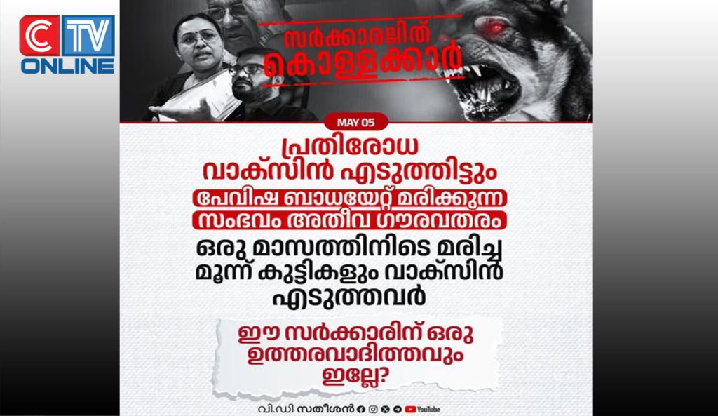 ഒരുമാസത്തിനിടെ പേവിഷ ബാധയേറ്റ് സംസ്ഥാനത്ത് മൂന്ന് കുട്ടികളാണ് മരിച്ചത്. ഏപ്രില് 9-ന് പത്തനംതിട്ട പുല്ലാട് സ്വദേശിയായ പതിമൂന്ന് വയസുകാരിയും വാക്സിന് എടുത്ത ശേഷമാണ് പേവിഷബാധയേറ്റ് മരിച്ചത്. ഏപ്രില് 29-ന് മലപ്പുറം സ്വദേശിയായ ആറു വയസുകാരനും ഇതേ രീതിയിലാണ് ജീവന് നഷ്ടമായത്. കഴിഞ്ഞ 5 വര്ഷത്തിനിടെ സംസ്ഥാനത്ത് പേ വിഷബാധയേറ്റ് മരിച്ച 102 പേരില് 20 പേര്ക്കാണ് വാക്സിനെടുത്തിട്ടും ജീവന് നഷ്ടപ്പെട്ടത്. തുടര്ച്ചയായി ഇത്തരം സംഭവങ്ങള് ഉണ്ടായിട്ടും വാക്സിന് സുരക്ഷിതമെന്നാണ് ആരോഗ്യവകുപ്പ് ന്യായീകരിക്കുന്നത്. ഇതേ സര്ക്കാരും ആരോഗ്യ വകുപ്പുമാണ് ഗുണനിലവാര പരിശോധന നടത്താത്തതും കാലാവധി കഴിഞ്ഞതുമായ മരുന്നുകള് ആശുപത്രികളില് വിതരണം ചെയ്തെന്ന് അടുത്തിടെ സി.എ.ജി കണ്ടെത്തിയത്. സര്ക്കാരിന്റെ കെടുകാര്യസ്ഥതയ്ക്കും അഴിമതിക്കും നമ്മുടെ കുഞ്ഞുങ്ങള് ഉള്പ്പെടെയുള്ളവരെ ബലിയാടാക്കുന്നത് അംഗീകരിക്കാനാകില്ല.എന്നദ്ദേഹം കുറ്റപ്പെടുത്തി .